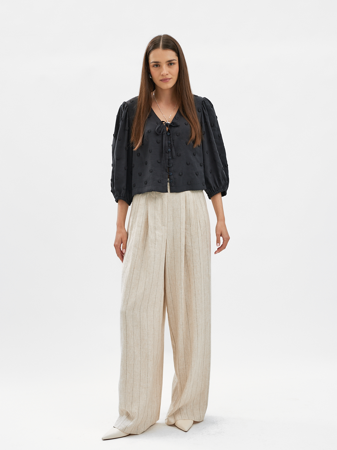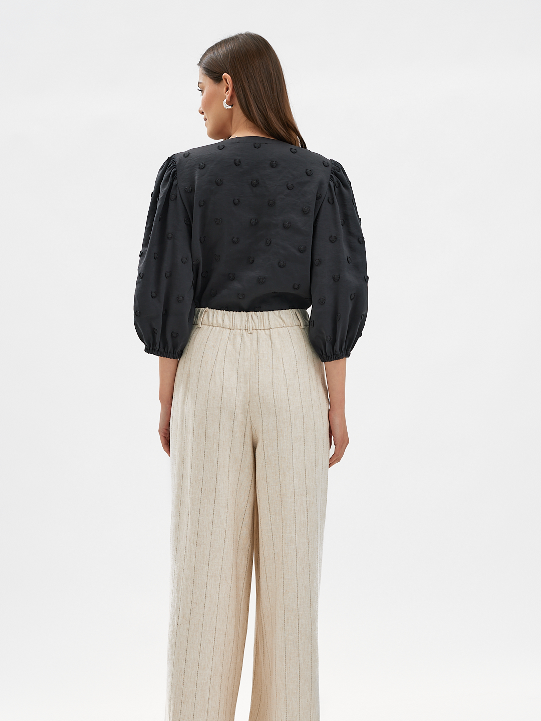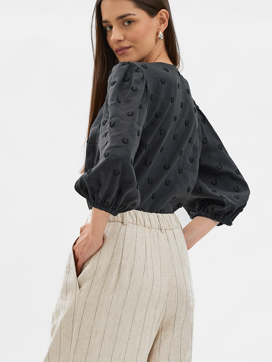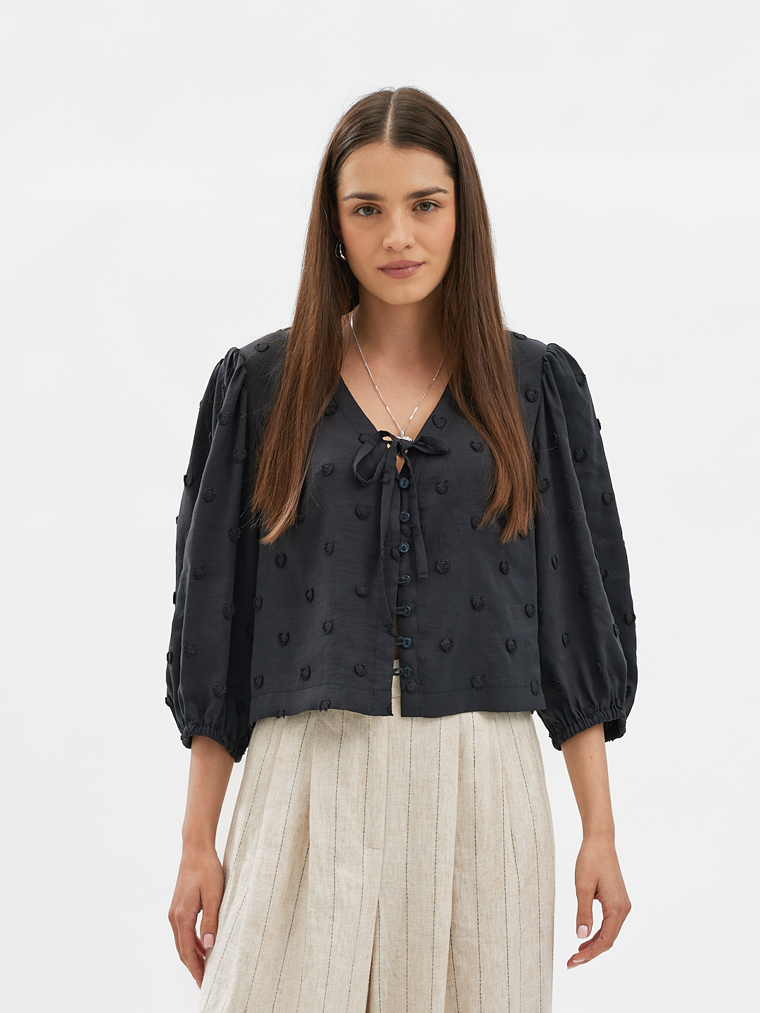 Bufiaste rękawy i lekko skrócony fason dodają jej lekkości, sprawiając, że świetnie odnajdzie się zarówno w codziennych stylizacjach, jak i w bardziej wyjątkowych zestawach.