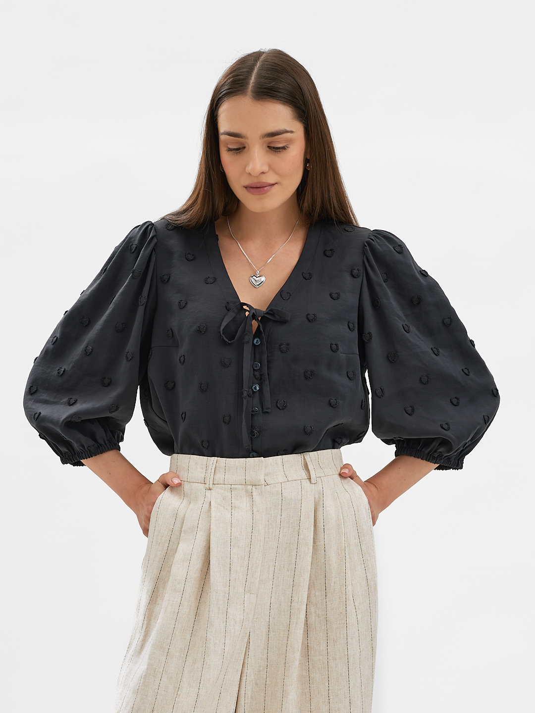 Wykonana z lekkiego żakardu o delikatnej fakturze drobnych serduszek, nadaje stylizacji wyjątkowego uroku.