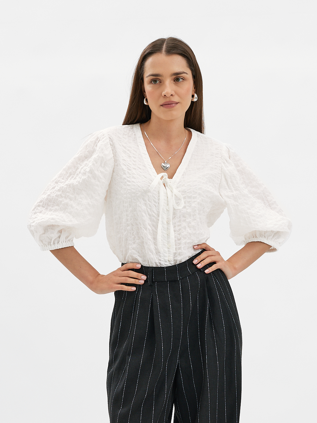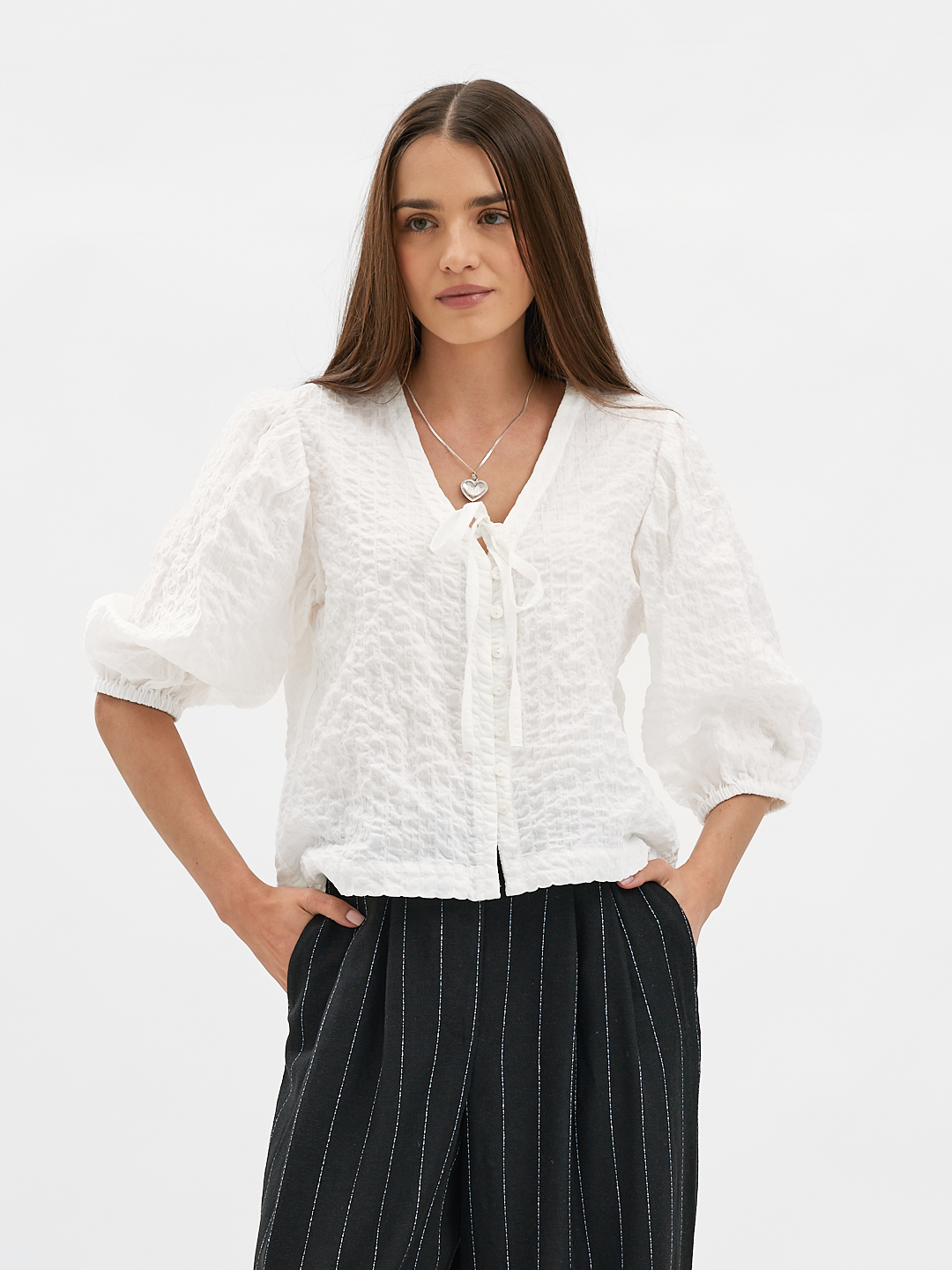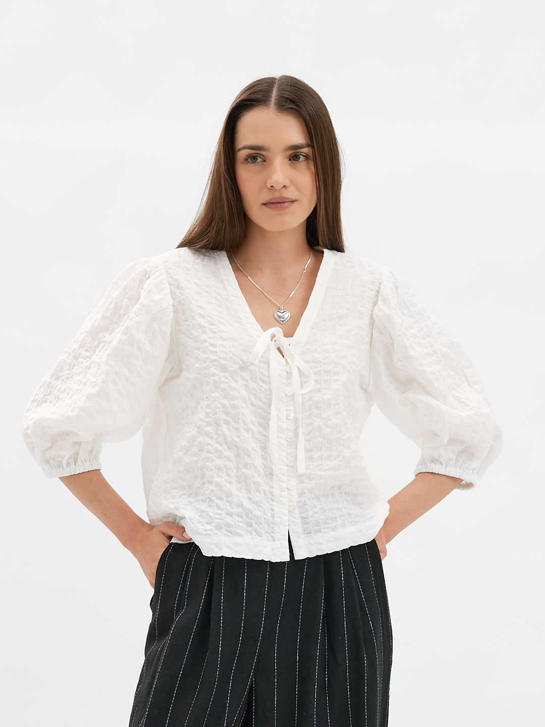 Bufiaste rękawy i lekko skrócony fason dodają jej lekkości, sprawiając, że świetnie odnajdzie się zarówno w codziennych stylizacjach, jak i w bardziej wyjątkowych zestawach.