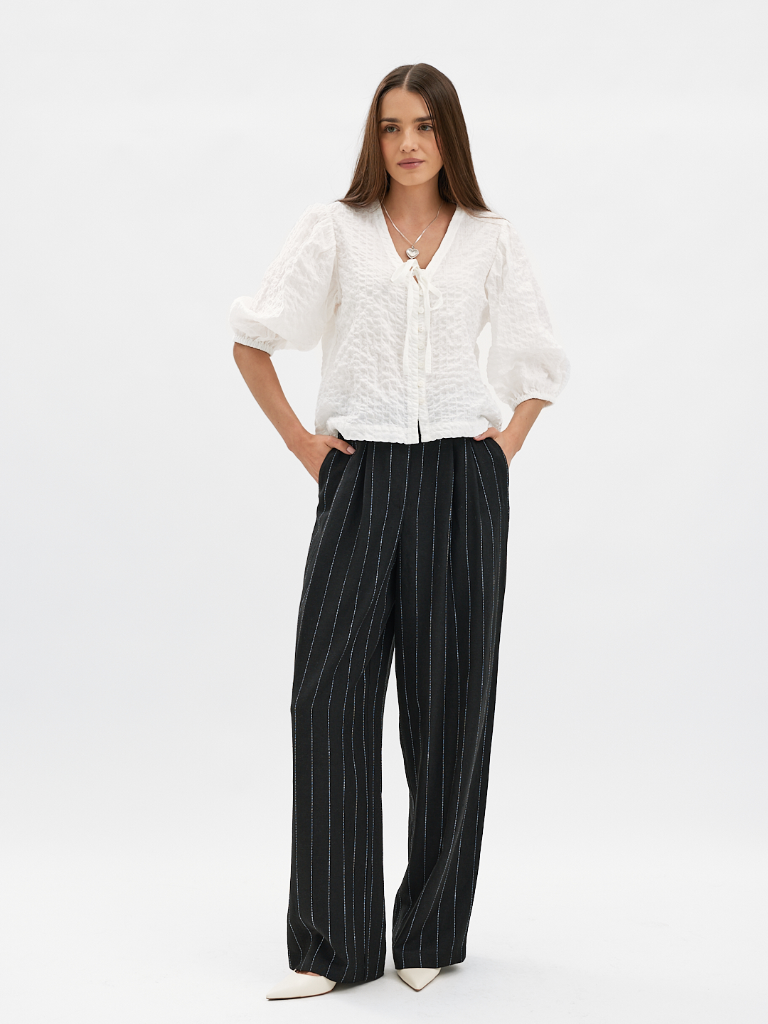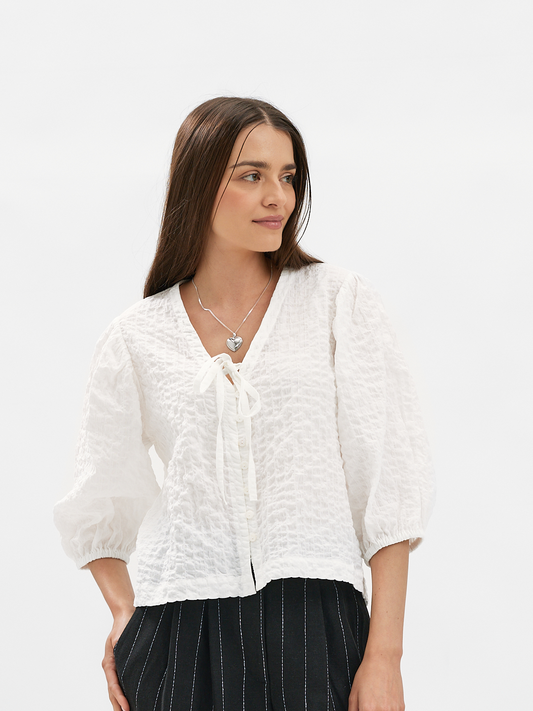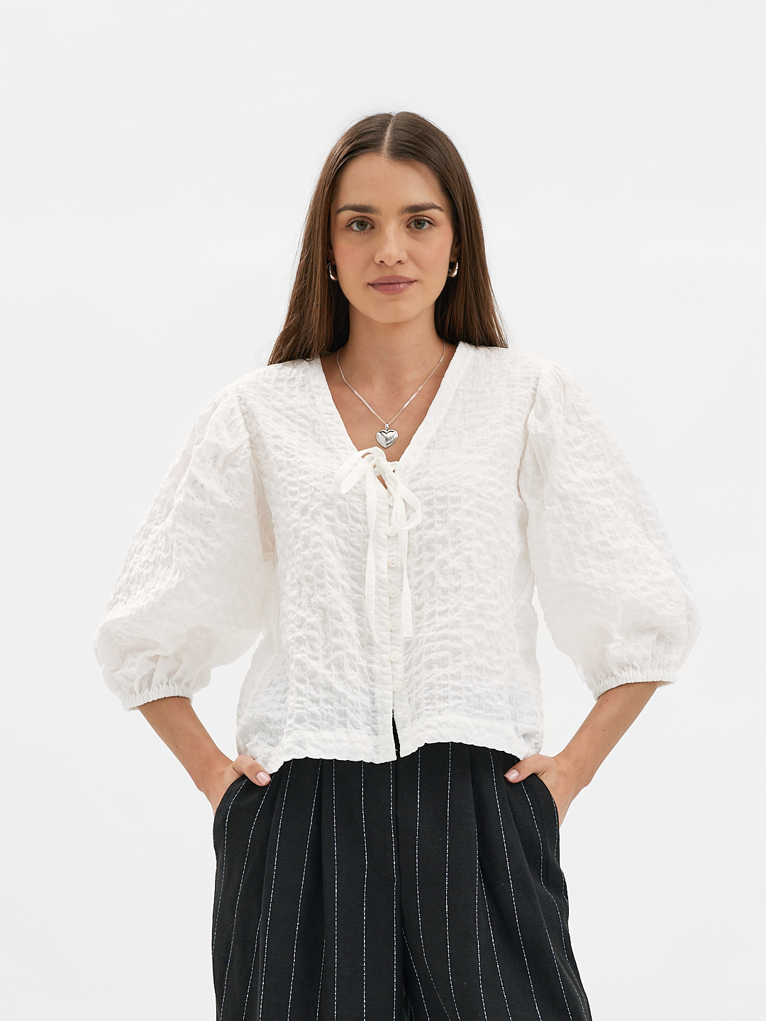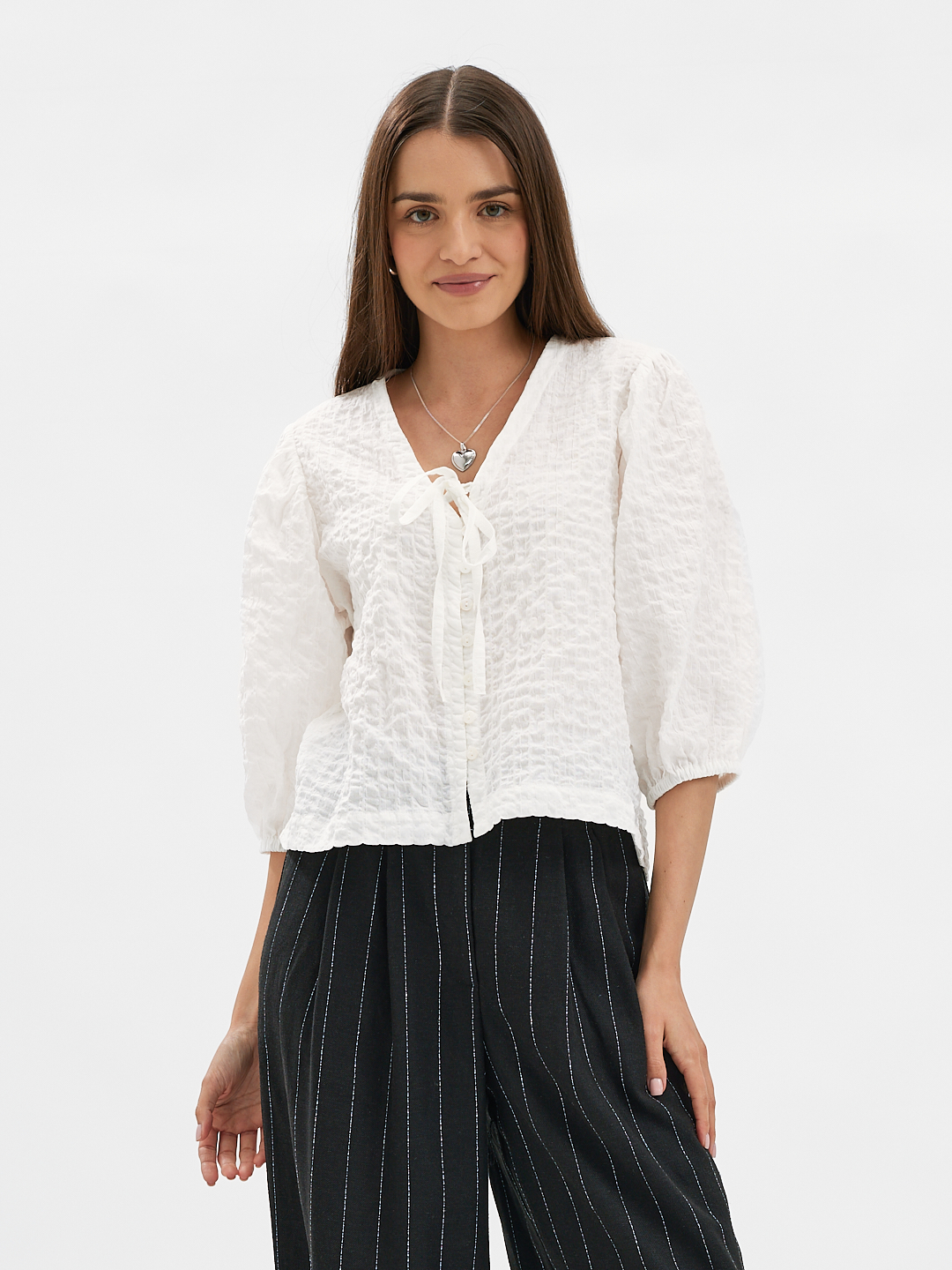 Bufiaste rękawy i lekko skrócony fason dodają jej lekkości, sprawiając, że świetnie odnajdzie się zarówno w codziennych stylizacjach, jak i w bardziej wyjątkowych zestawach.