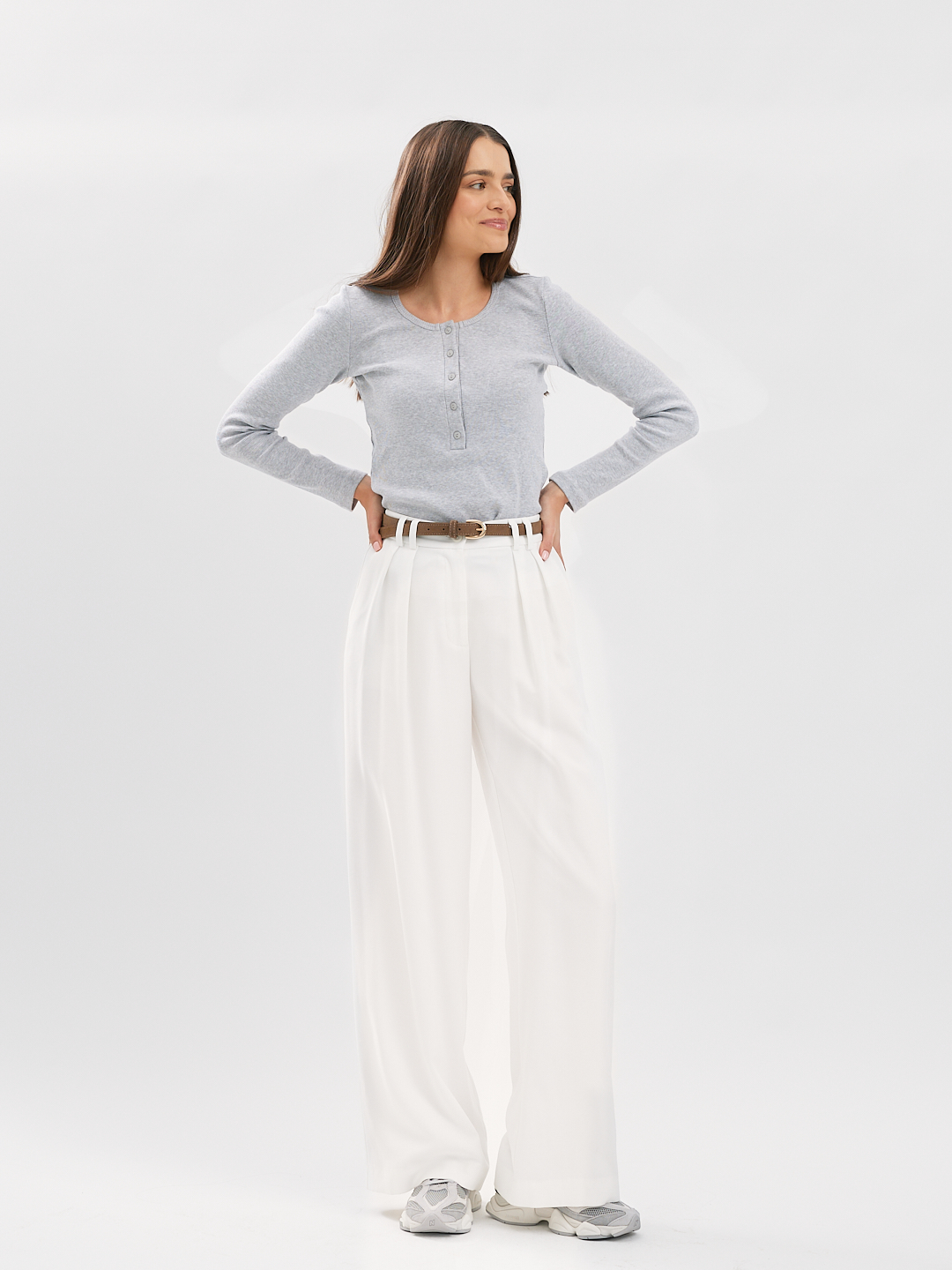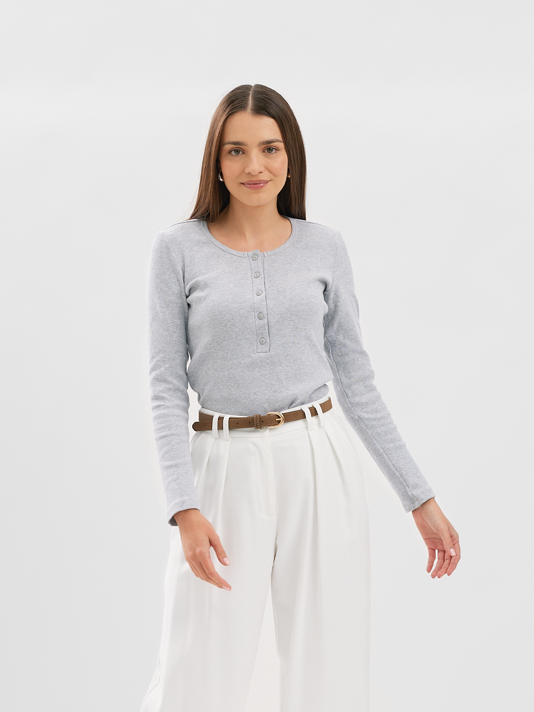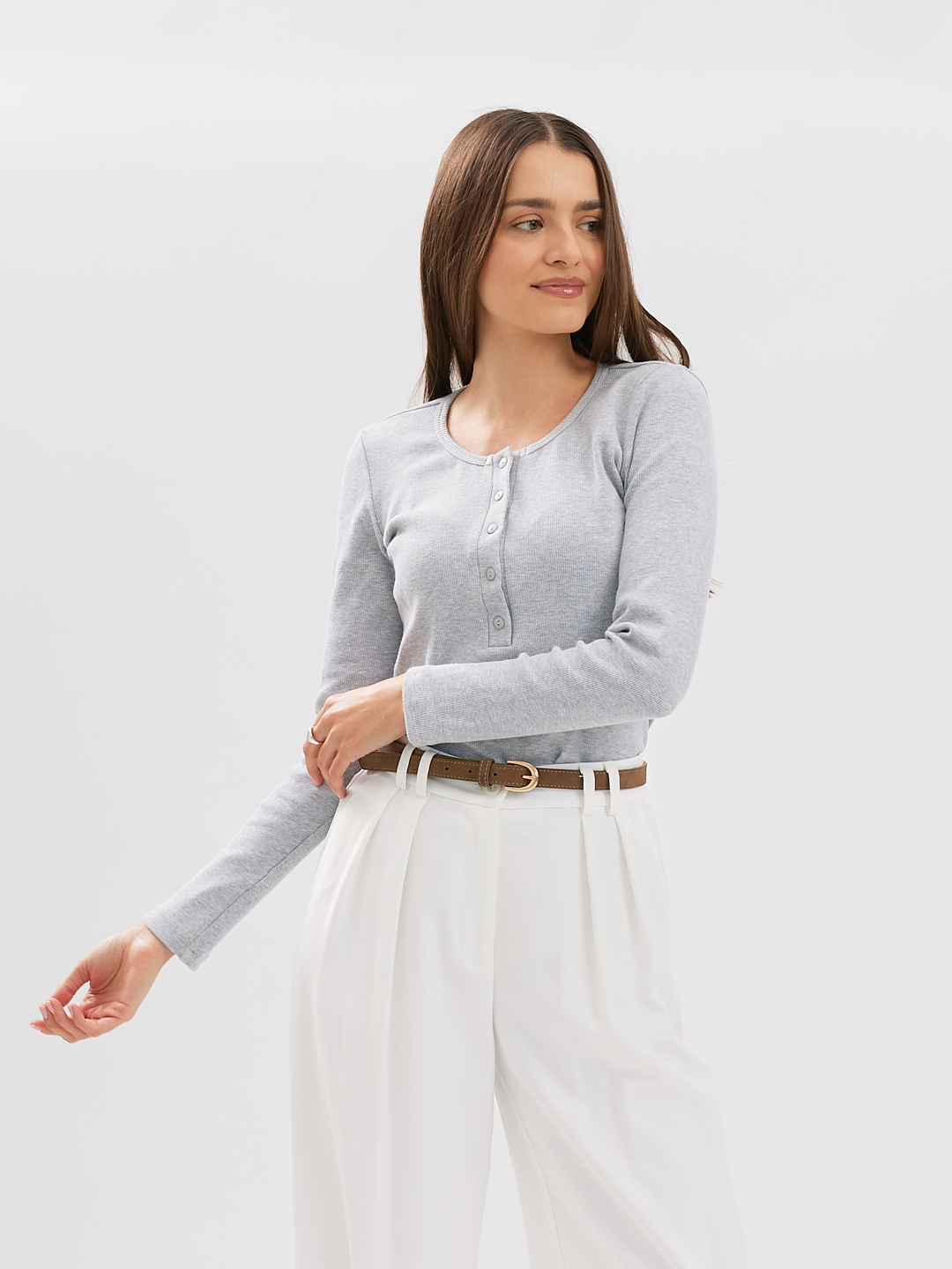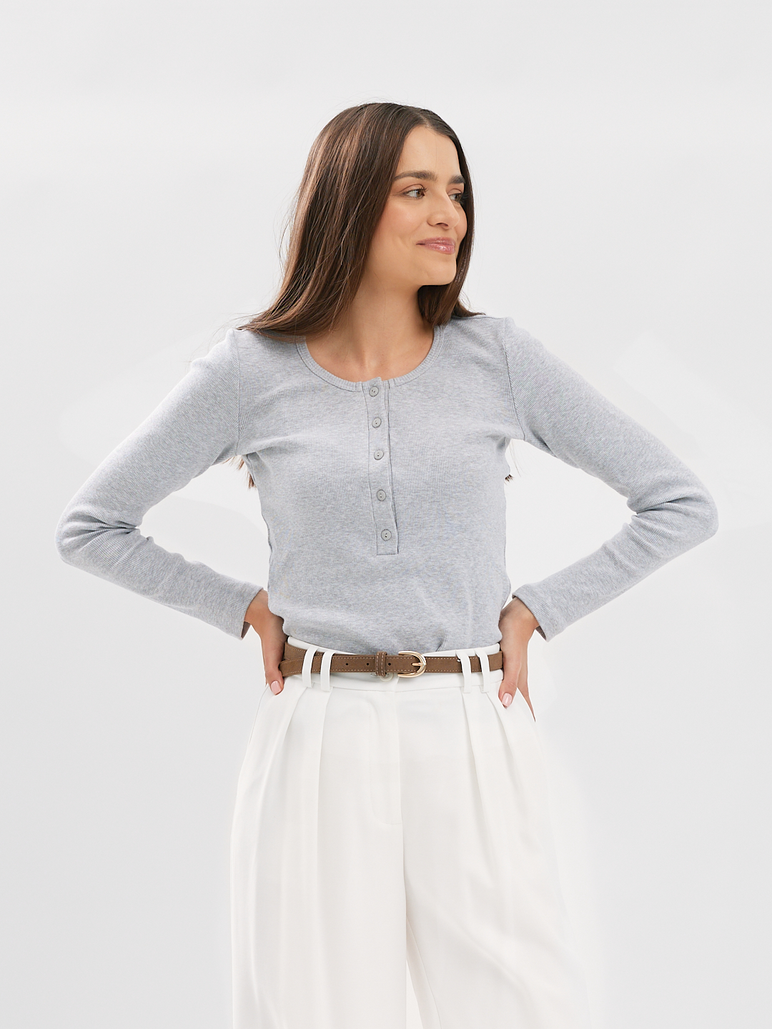 Longsleeve o lekko dopasowanym kroju z okrągłym dekoltem wykończonym szeroką lamówką oraz plisą z guzikami z naturalnego kokosa.