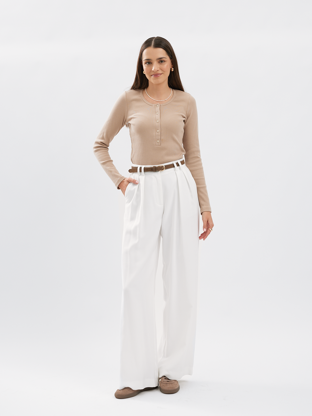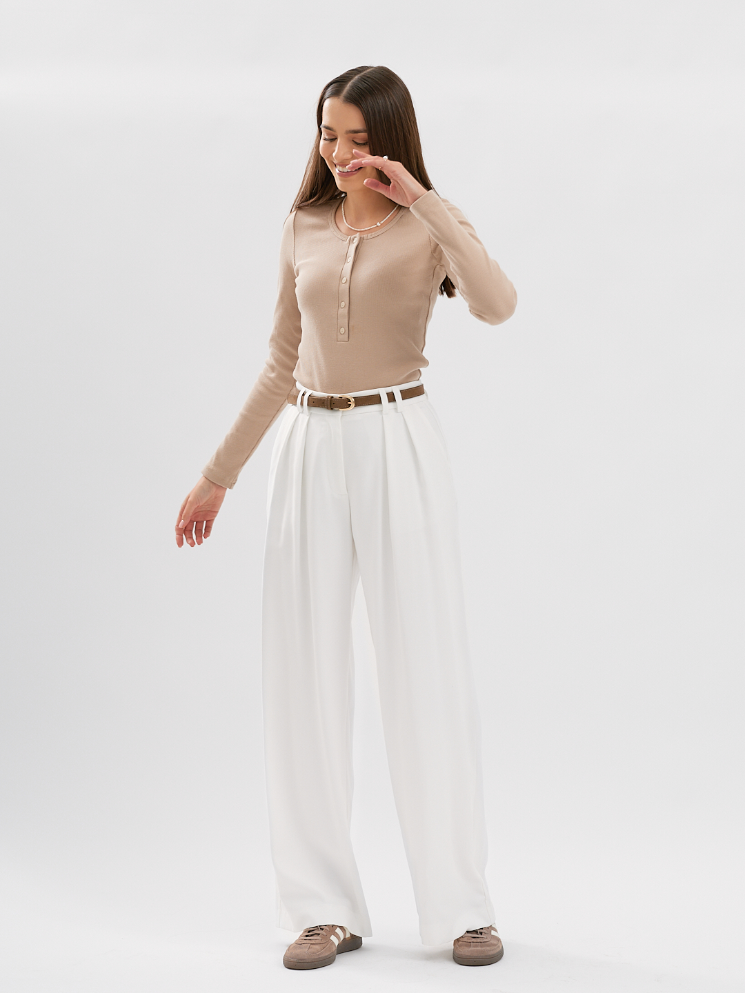 Longsleeve o lekko dopasowanym kroju z okrągłym dekoltem wykończonym szeroką lamówką oraz plisą z guzikami z naturalnego kokosa.