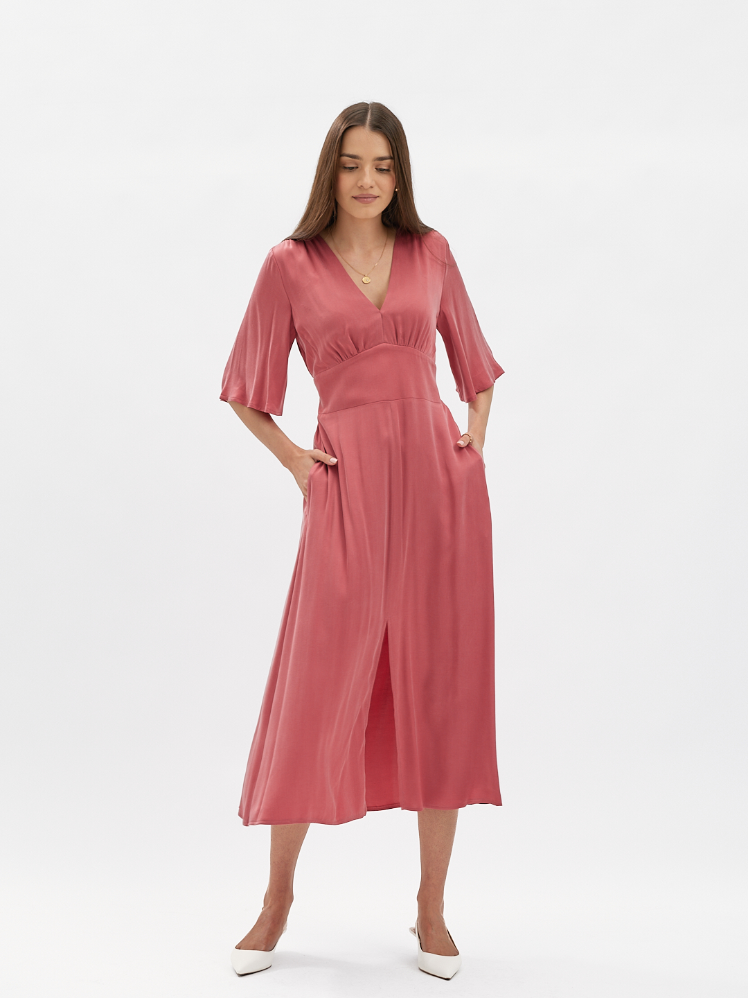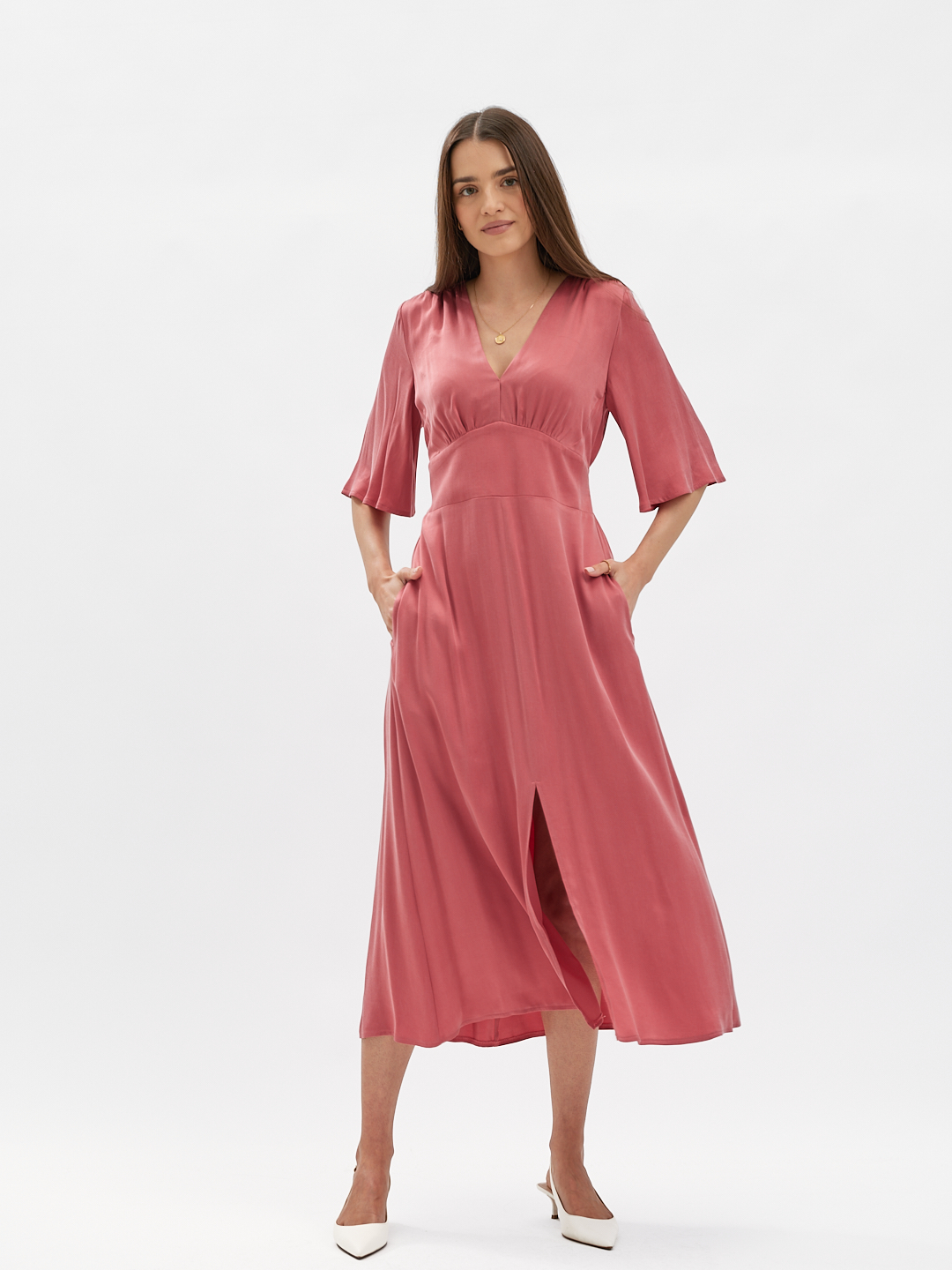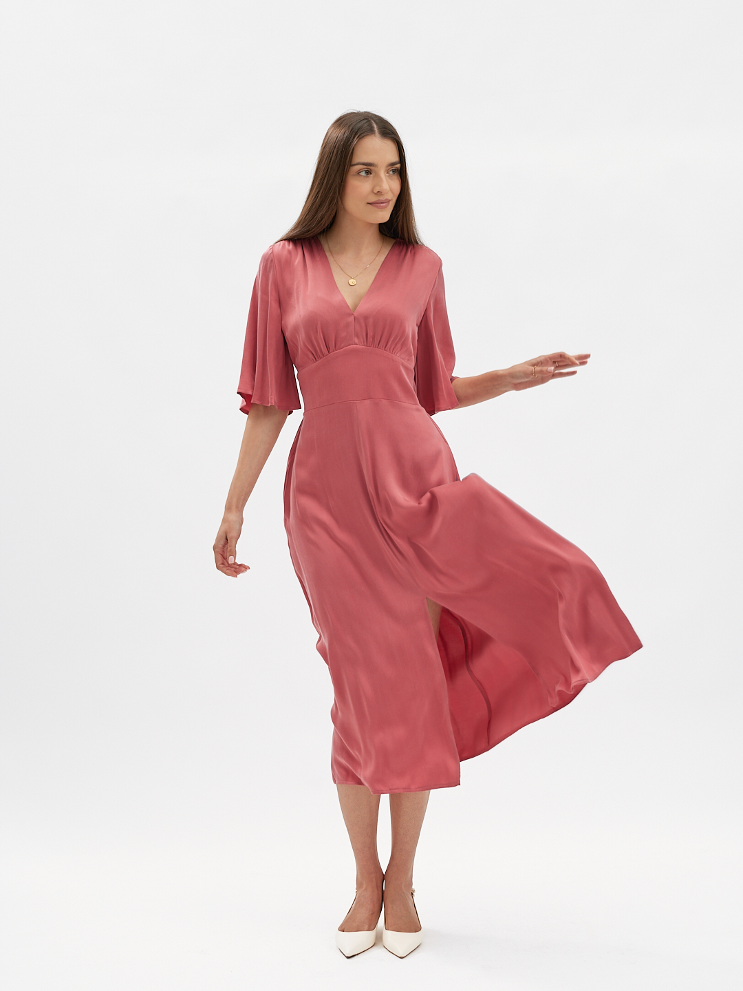 Z przodu szeroki, elegancki pas wyraźnie podkreśla talię. Z tyłu elastyczne gumeczki dopasowują sukienkę do figury, zapewniając jednocześnie komfort noszenia. Lekko rozkloszowana spódnica z rozcięciami na środku porusza się płynnie z każdym krokiem, nadając całości lekkości i subtelnej zmysłowości.