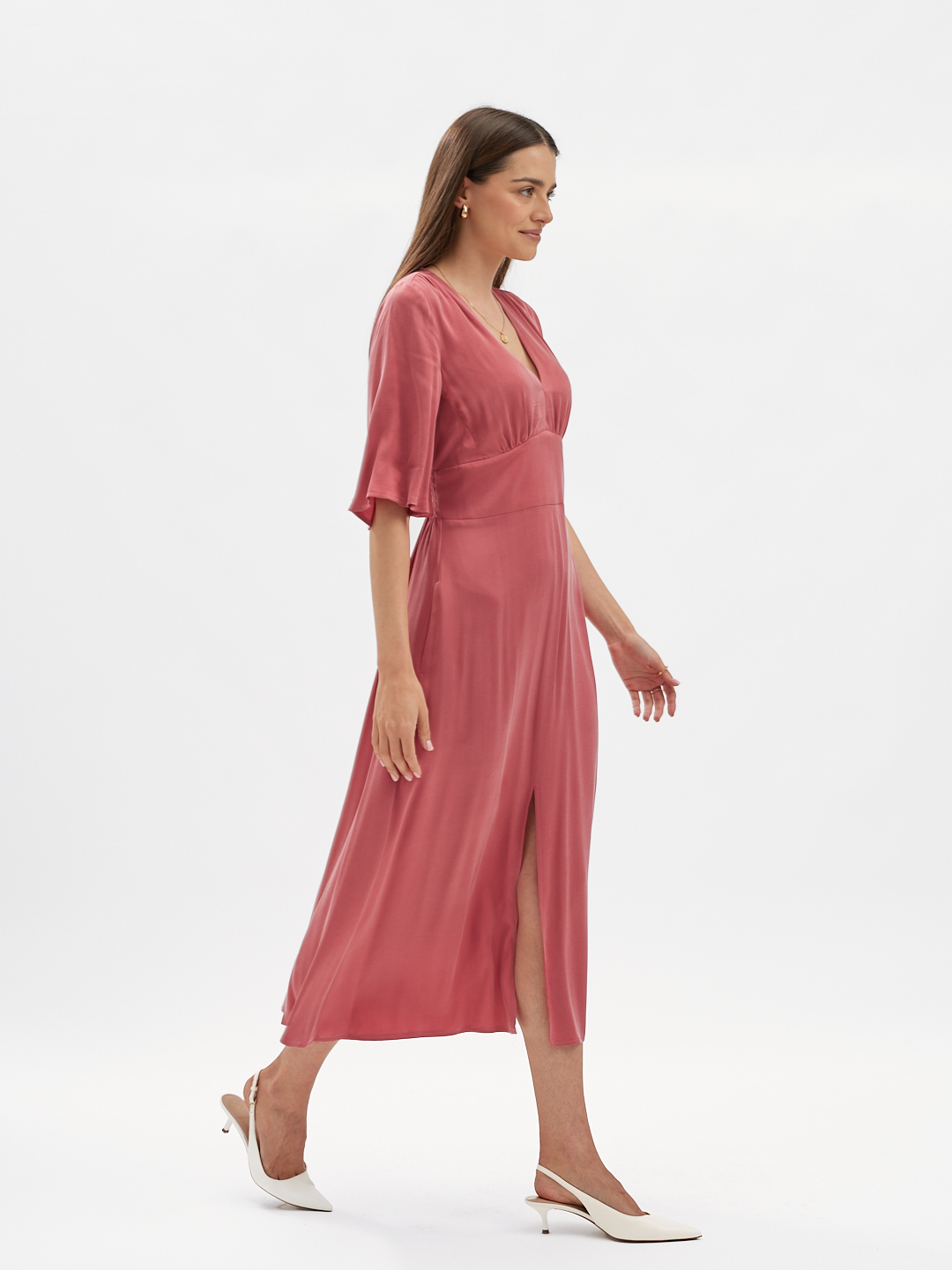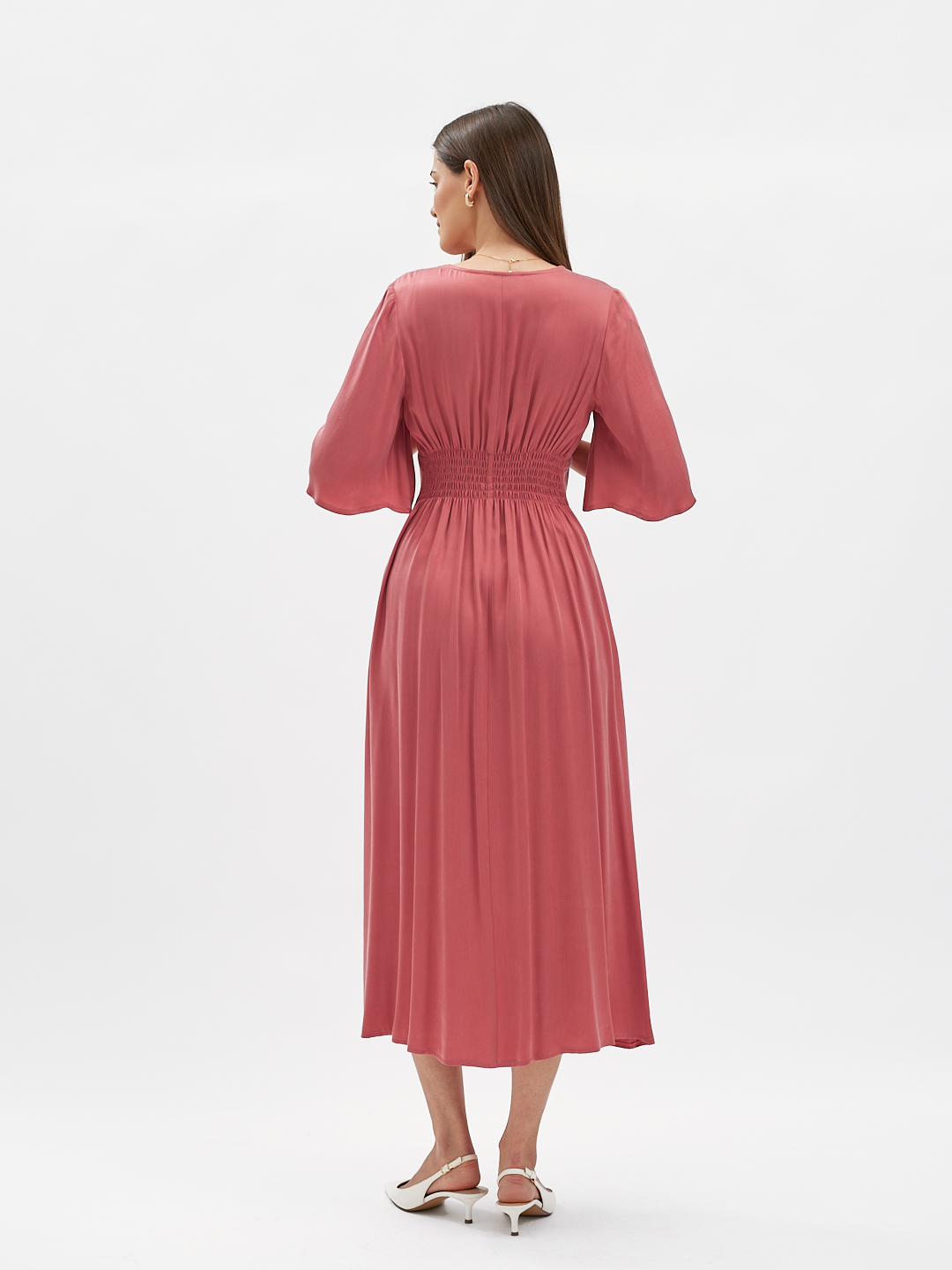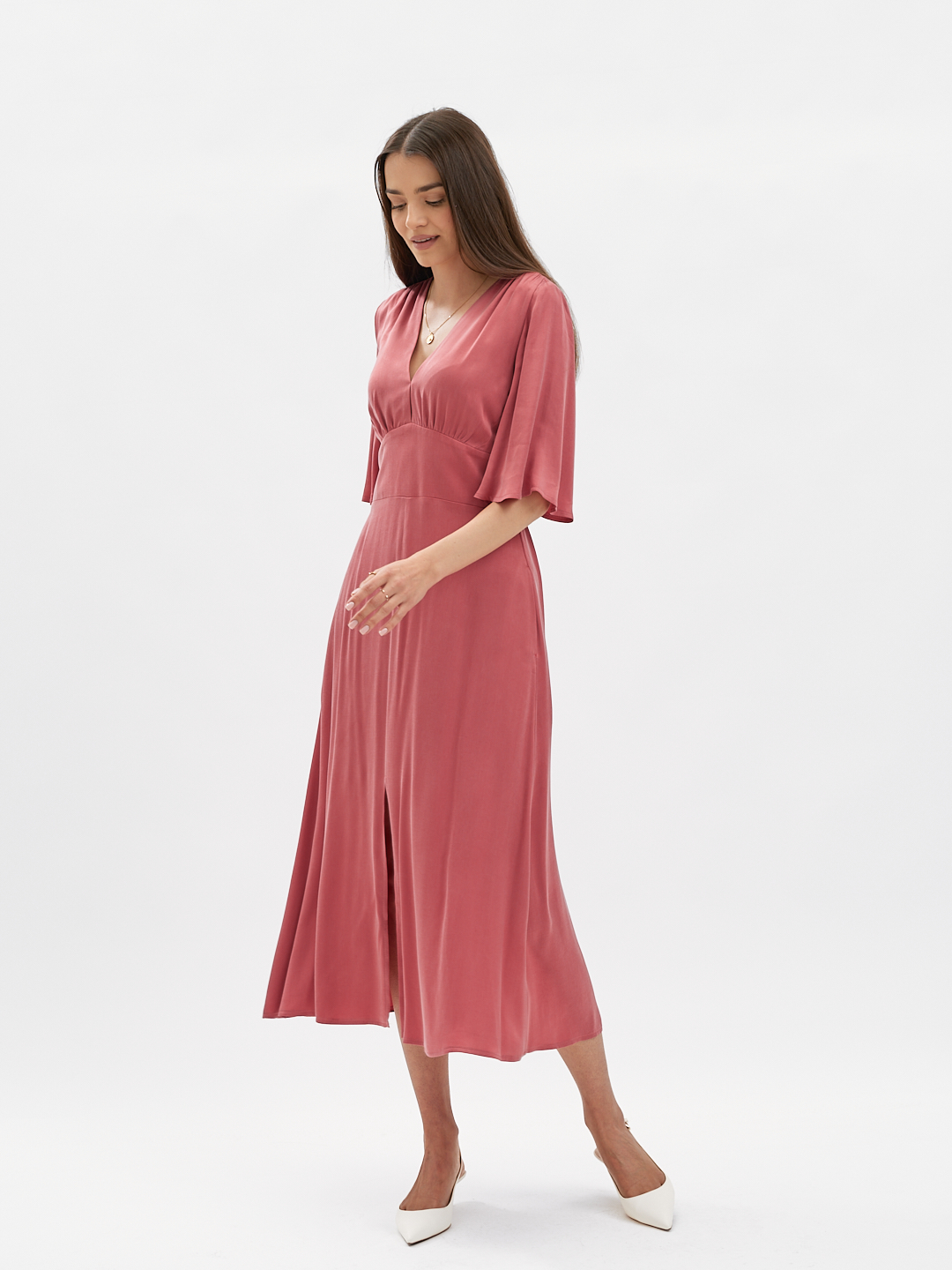 Z przodu szeroki, elegancki pas wyraźnie podkreśla talię. Z tyłu elastyczne gumeczki dopasowują sukienkę do figury, zapewniając jednocześnie komfort noszenia. Lekko rozkloszowana spódnica z rozcięciami na środku porusza się płynnie z każdym krokiem, nadając całości lekkości i subtelnej zmysłowości.